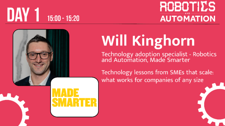 Will Kinghorn, technology adoption specialist – robotics and automation at Made Smarter, will discuss the lessons learnt through technology from SMEs that scale.